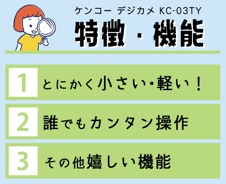 メーカー保証:1年間 デジタルカメラ KC-03TY 日常を気軽に撮って楽しむ、お散歩カメラ いつもポケットに入れて、日常の景色を気軽に撮れるスリム・軽量な800万画素デジ...