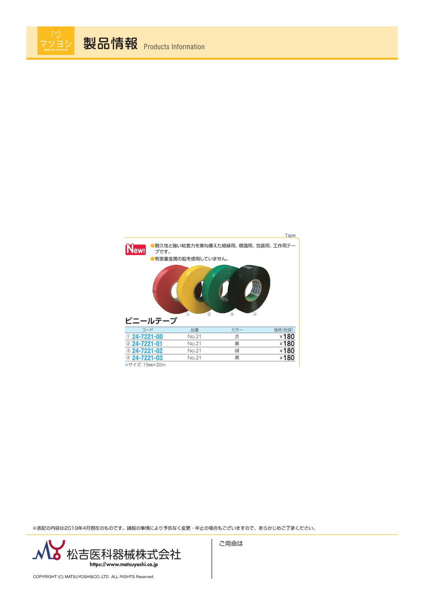 【病院専用商品】ビニールテープ NO.21(ミドリ)19MMX20M品番 24-7221-02--1入り 医療機器対象外 病棟 供給サポート・メンテナンス 定価\180 ●商品説明 ●耐久性と強い粘...